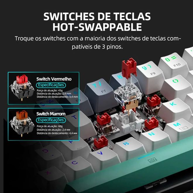 O grande diferencial deste teclado, e o que o torna tão especial, é a sua placa com tecnologia hotswap. Isso permite que o usuário troque os switches mecânicos de forma rápida e fácil, sem a necessidade de qualquer ferramenta de solda. Ele vem equipado com switches Blue, que são conhecidos por seu feedback tátil e o “clique” audível a cada pressionamento, sendo os favoritos de muitos digitadores. No entanto, se no futuro você preferir a sensação linear de um switch Red para jogos ou o silêncio de um switch Brown, basta comprar os switches separadamente e fazer a troca em minutos. É o máximo de customização pelo menor preço.