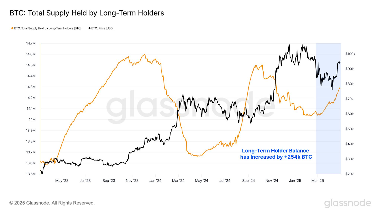 Como o preço de ouro (XAU) sinaliza uma reversão potencial de mercado após uma manifestação impressionante desde o primeiro trimestre de 2024, a rotação de capital para o Bitcoin (BTC) acelerou. De acordo com os dados do mercado da GlassNode, os detentores de longo prazo adicionaram mais de 254 mil BTCs nos últimos três meses para atualmente possuem cerca de 14,3 milhões de moedas.