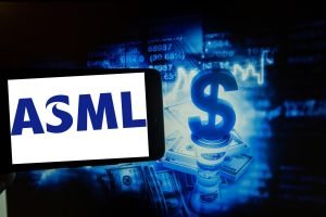 O logotipo da ASML é visto em uma tela ao lado de uma ilustração do mercado de ações. (Foto por … [+]
