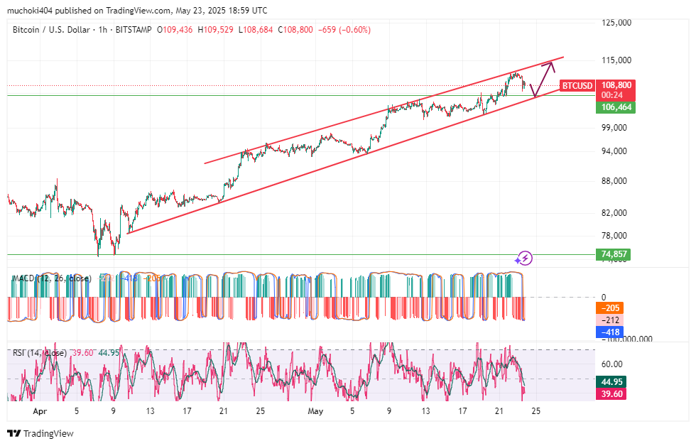 No prazo de 1 hora, Preço do BTC está subindo em um canal paralelo desde uma baixa local de cerca de US $ 74,8 mil no início de abril. No início desta semana, o preço do BTC foi rejeitado na borda superior do canal em ascensão e agora está sinalizando uma queda em direção à borda inferior.