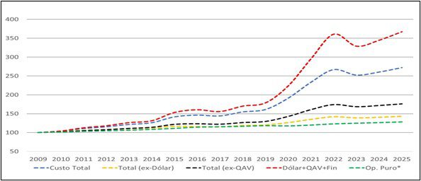 Essa dinâmica é analisada na tabela a seguir, com base em dados da Anac entre 2009 e 2025, decompostos por fontes de custo e ponderados pela participação das empresas na receita operacional líquida do setor.