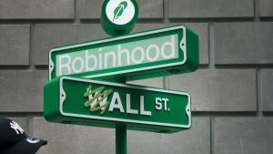 Uma placa em Wall Street no dia do IPO da Robinhood.