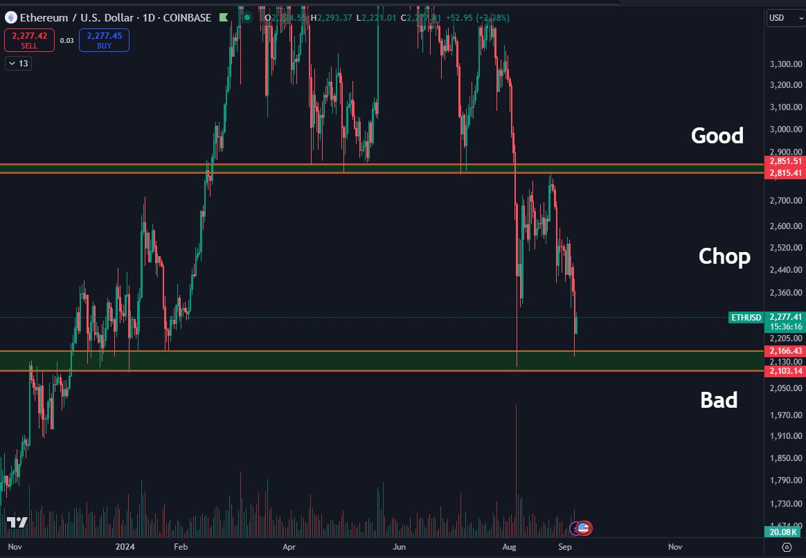“Até agora, o ETH viu um salto sólido do suporte. No entanto, acho que continuará instável enquanto o preço estiver sendo negociado na faixa de US$ 2.100 a US$ 2.850.”