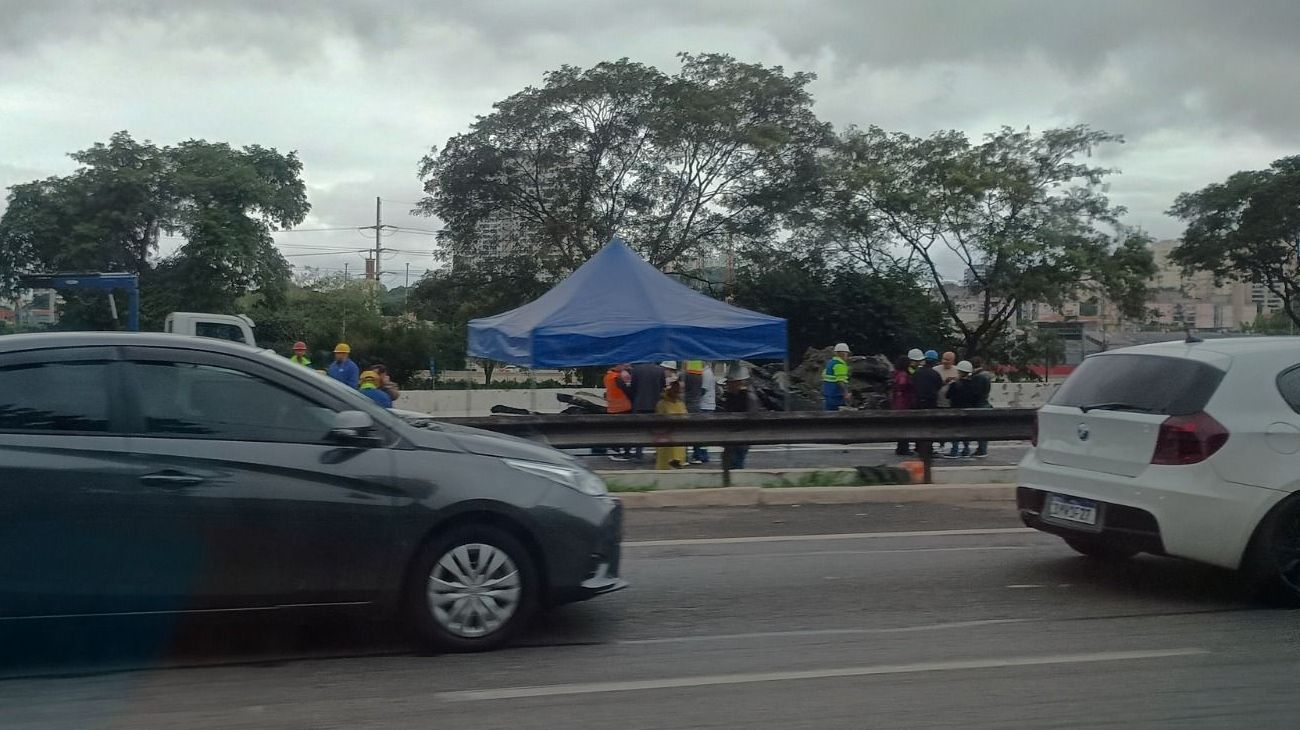 A interdição é total na pista central da Marginal Tietê, sentido Castelo Branco, na altura da saída da Rodovia dos Bandeirantes, a cerca de 300 metros da Ponte Atílio Fontana.