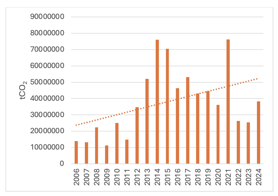 Gráfico 1: Emissão anual de CO2 pelo Sistema interligado Nacional (2006-2024)