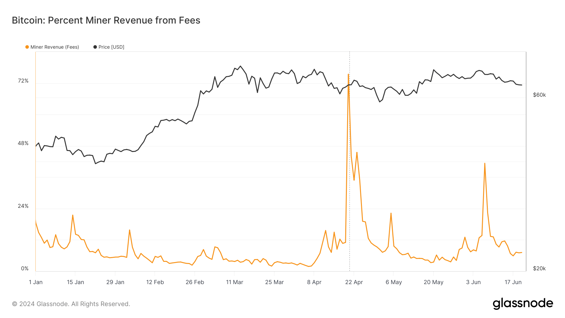 Os mineradores de Bitcoin estão passando por uma mudança notável em suas fontes de receita, impulsionada principalmente por mudanças na dinâmica das taxas de transação. Dados recentes da Glassnode ilustram uma tendência flutuante na porcentagem da receita da mineradora derivada de taxas de transação ao longo do ano. No início de 2024, a receita das taxas dos mineiros aumentou drasticamente em abril, atingindo quase 72%, antes de se estabilizar em torno de percentagens mais baixas nos meses subsequentes. Este aumento coincide com o lançamento de Runas durante o halving, causando aumento nas taxas, indicando maior demanda por processamento de transações.
