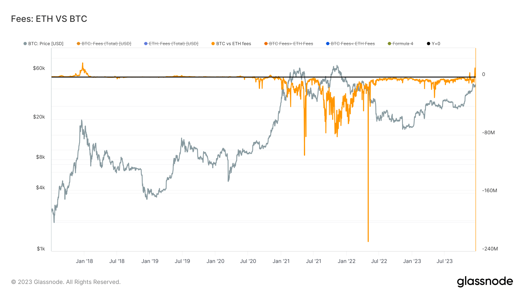 Uma dinâmica semelhante, embora breve, foi observada durante o frenesi de inscrições em maio de 2023, quando as taxas do Bitcoin excederam as do Ethereum por um período fugaz de 3-4 dias, marcando-o como uma anomalia em vez de uma tendência consistente.