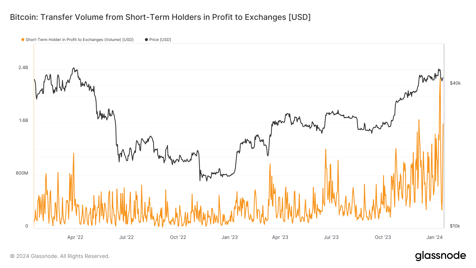 Recentemente, houve um aumento notável nas atividades de detentores de curto prazo (STHs), definidos como investidores que detiveram Bitcoin por menos de 155 dias. Em 12 de janeiro, CriptoSlate relatou a atividade de titulares de curto prazo mais significativa desde maio de 2021, com US$ 6,1 bilhões em Bitcoin transferidos. Esta transferência massiva é atribuída principalmente à realização de lucros, já que o valor do Bitcoin subiu para um máximo de US$ 49.000 devido ao ETF.