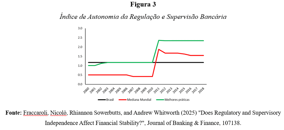 Com esse objetivo, Nicolò Fraccaroli, da Universidade Brown, Rhiannon Sowerbutts, do Banco Mundial, e Andrew Whitworth, do Banco da Inglaterra, desenvolveram um indicador específico para mensurar, de forma comparável entre países e ao longo do tempo, o grau de autonomia legal das autoridades de regulação e supervisão bancária (RSI). O índice avalia a proteção institucional do supervisor com base, entre outros aspectos, na autonomia orçamentária, na estabilidade institucional, nas regras de nomeação e demissão e na blindagem das decisões técnicas frente a interferências políticas, em três dimensões cuja soma varia de 0 (ausência de autonomia) a 3 (autonomia plena).