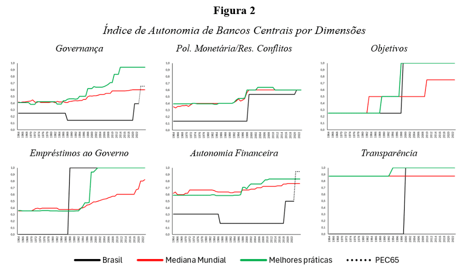 Entretanto, nas dimensões de autonomia financeira e de governança, o BCB permanece abaixo do nível observado nas melhores práticas internacionais. Essas dimensões são centrais para a autonomia efetiva, pois condicionam a capacidade de exercício da autonomia legal ao longo do tempo, especialmente em contextos de restrição fiscal ou maior pressão política.