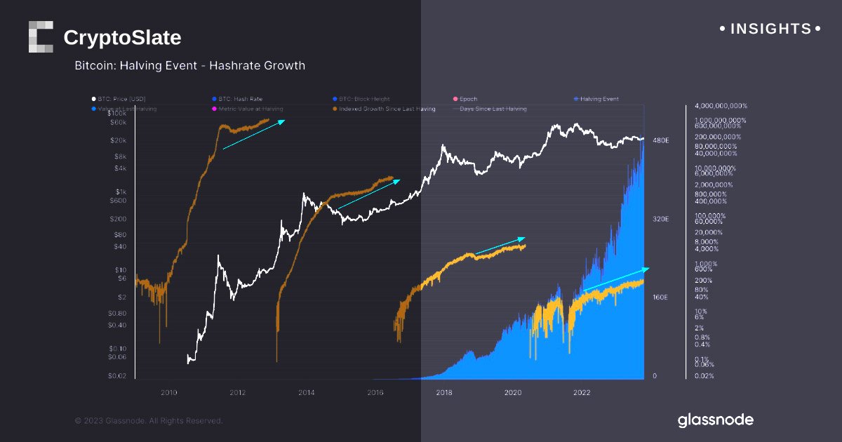 Como Bitcoin (Bitcoin) se aproxima do seu próximo evento de redução para metade em abril de 2024, um padrão único de progresso marcado por retornos decrescentes está a tornar-se aparente. A taxa de hash, uma medida crítica do desempenho dos mineiros, está atualmente a ultrapassar os 400 Eh/s, mantendo uma dinâmica de crescimento robusta. No entanto, cada evento sucessivo de redução pela metade do Bitcoin revela uma história sutil: o progresso, embora constante, não reflete os aumentos observados nos estágios iniciais da redução pela metade.