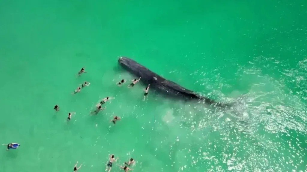 A baleia apareceu no sábado (09) na praia de Rockingham, onde as pessoas nadavam perto dela, tocando-a e fazendo selfies.