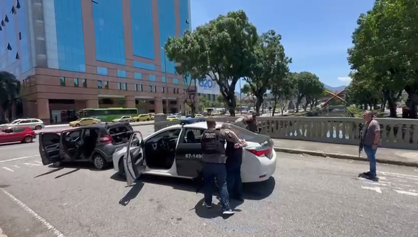 Nesta tarde, os policiais realizaram diligências para encontrar os criminosos, que estavam num carro Fiat Mobi cinza que havia sido roubado em Brás de Pina, na Zona Norte do Rio, no ano passado. A placa do veículo ainda era clonada. Houve perseguição policial na Avenida Presidente Vargas, uma das principais vias do Centro do Rio. Veja o vídeo: