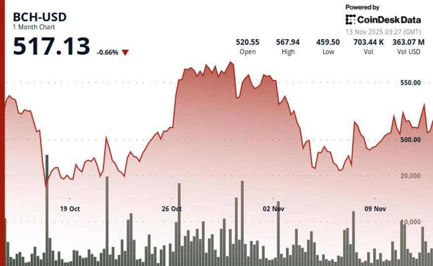 De acordo com o modelo de dados de análise técnica da CoinDesk Research, registrou ganhos sólidos durante a sessão de quarta-feira, avançando 1,9%, de US$ 508,32 para US$ 518,01, em meio ao aumento da volatilidade nos mercados de criptografia. O movimento estabeleceu um claro impulso de alta dentro de uma faixa de negociação de US$ 32,78, representando 6,4% de volatilidade intradiária, já que o BCH teve um desempenho superior, enquanto a maioria das altcoins tropeçaram nas principais zonas de resistência.