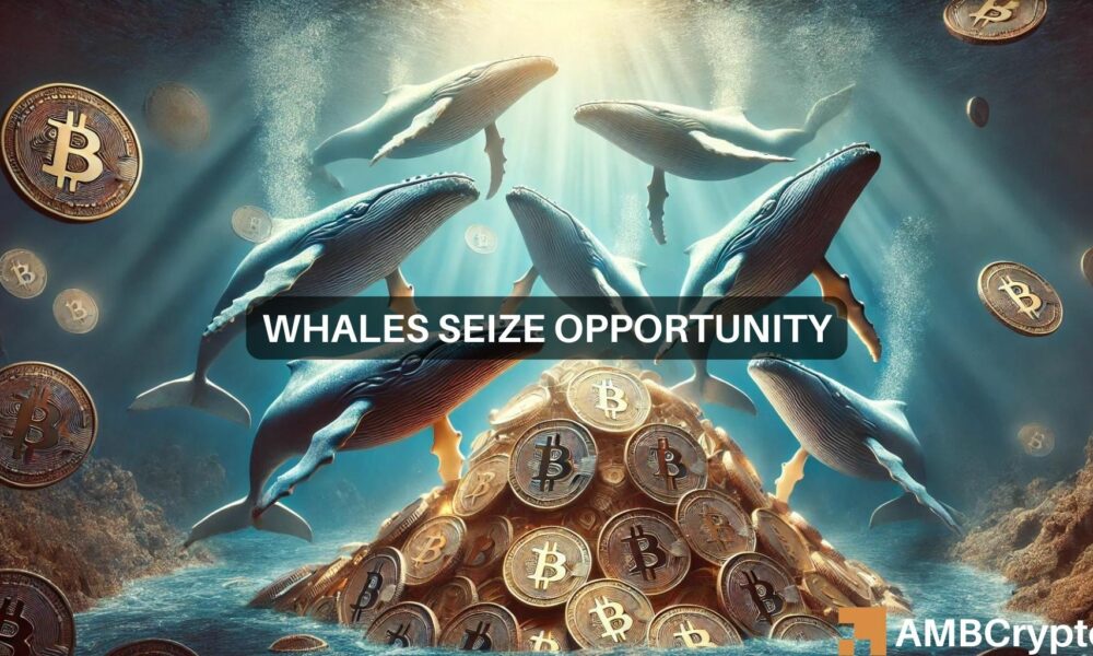 • Baleias cripto acumularam 5.900 BTC no valor de US$ 397 milhões de CEXs em meio à queda de preço.