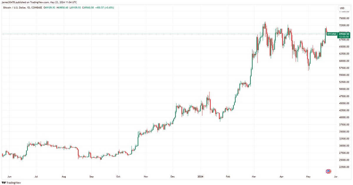 O Bitcoin está sendo negociado atualmente pouco abaixo de US$ 70.000, um nível de resistência crítico, enquanto seu máximo histórico (ATH) custa cerca de US $ 73.600. A comunidade de ativos digitais aguarda ansiosamente a decisão sobre o ETF Ethereumo que poderia potencialmente impulsionar o Bitcoin a novos patamares.