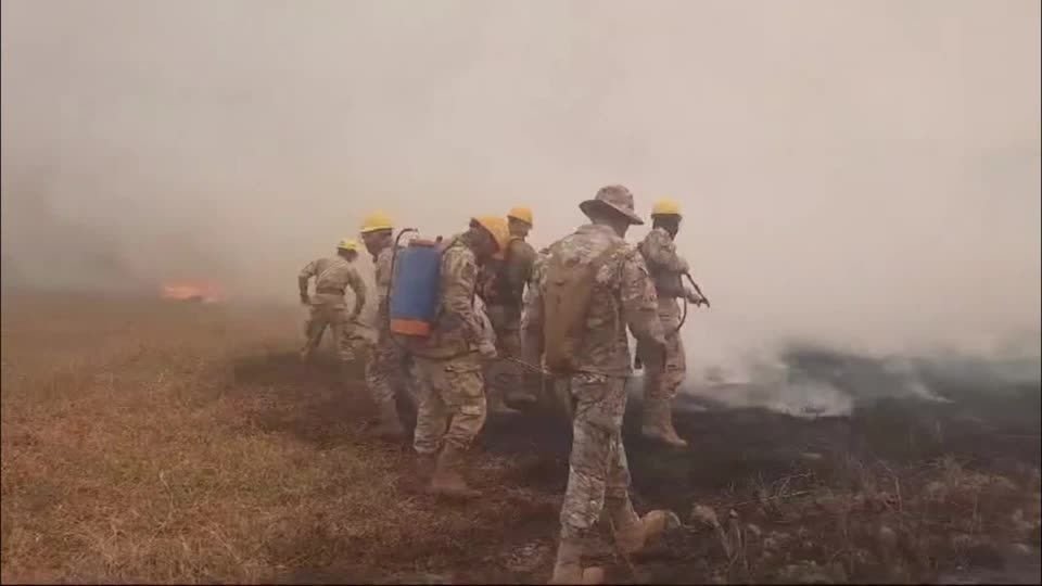 Bombeiros, policiais e as Forças Armadas se mobilizaram para a região produtora de soja de Santa Cruz, na Bolívia, na terça-feira (10) e na quarta-feira (11), para combater graves incêndios florestais que devastaram terras agrícolas por semanas.