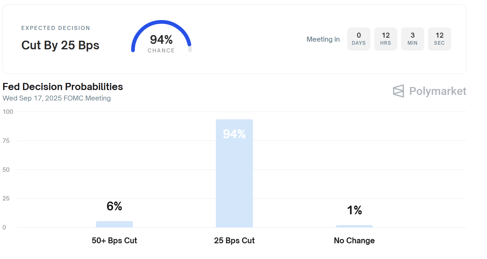 O Polymarket e o CME Fedwatch estão alinhados: o ciclo de flexibilização do Fed começa amanhã. Ambos têm um corte de 25 bps trancado para a próxima reunião do FOMC, com o prédio de chances de um caminho de três cortados até o final do ano.