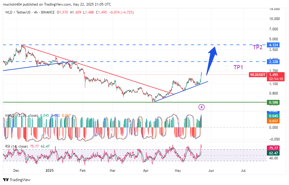 Assim como no mercado mais amplo da Altcoin, o preço do WLD registrou força otimista desde a primeira semana de abril de 2025, após a flexibilização da guerra comercial. No período de quatro horas, o preço do WLD vem formando altos mais altos e baixos mais altos, uma característica de uma tendência crescente.