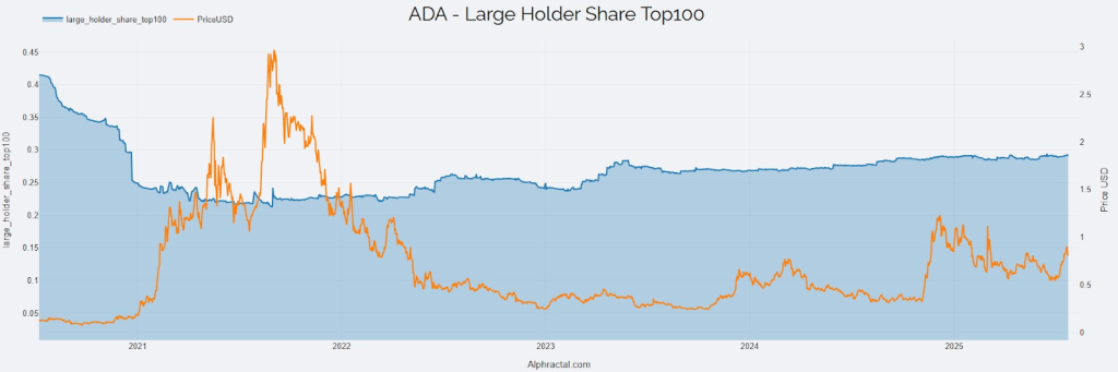 As últimas atualizações do Cardano revelam que os principais titulares da ADA, carteiras com mais de 100.000 ADA, aumentaram suas posições em quase 30% este ano. Isso sugere que as baleias estão construindo apostas a longo prazo à medida que a confiança retorna.