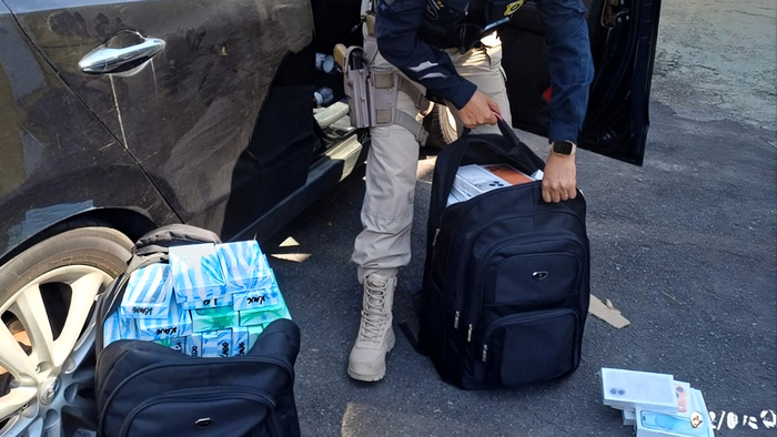 A forma improvisada de armazenamento chamou a atenção dos agentes, já que os equipamentos estavam distribuídos em mochilas, ocupando praticamente todo o espaço interno do carro.