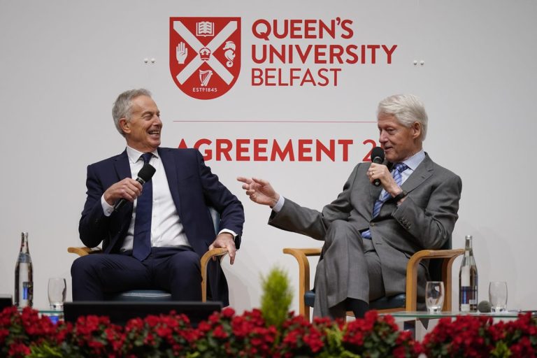 BELFAST, IRLANDA DO NORTE – 17 DE ABRIL: Ex-primeiro-ministro britânico, Tony Blair (L) e ex-EUA … [+] O presidente Bill Clinton dividiu o palco no primeiro dia de uma conferência de três dias para marcar o 25º aniversário do Acordo…
