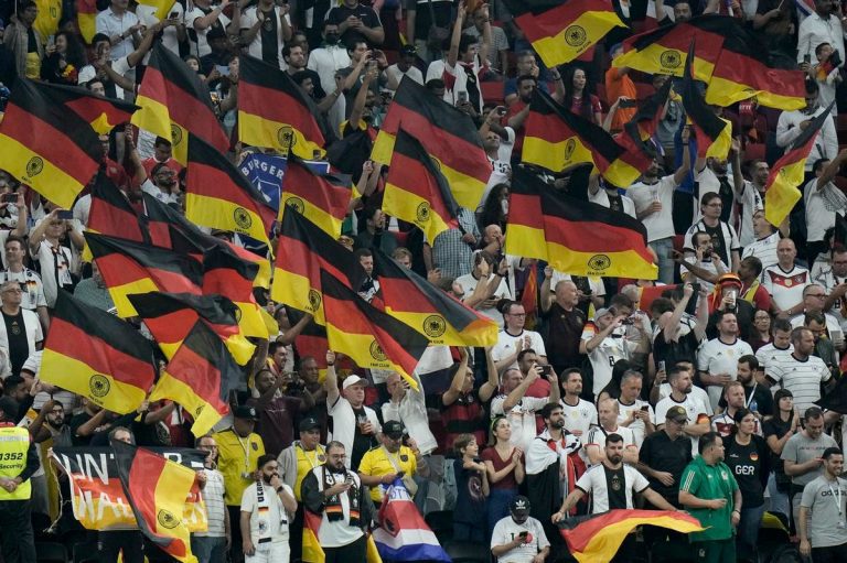 Torcedores de futebol da Alemanha seguram bandeiras alemãs antes da partida de futebol do grupo E da Copa do Mundo entre Costa … [+] Rica e Alemanha no Al Bayt Stadium em Al Khor, Catar, quinta-feira, 1º de dezembro de…