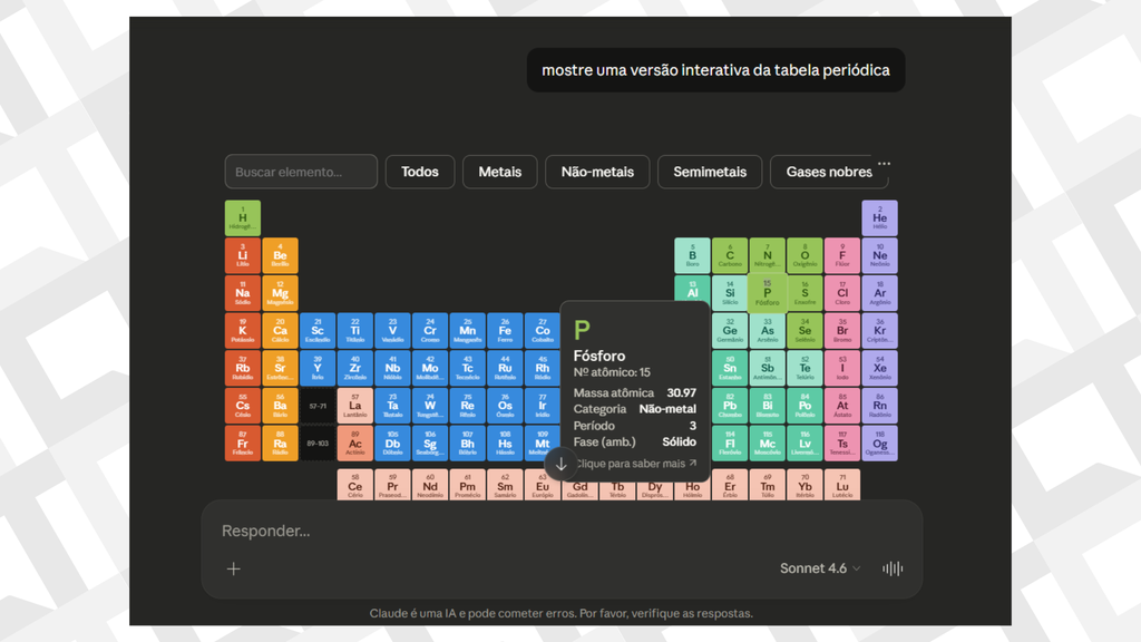 O resultado é uma experiência visual muito mais intuitiva. Ao pedir para o chatbot explicar sobre a tabela periódica, por exemplo, a ferramenta pode gerar uma versão clicável da tabela e trazer detalhes sobre cada elemento.