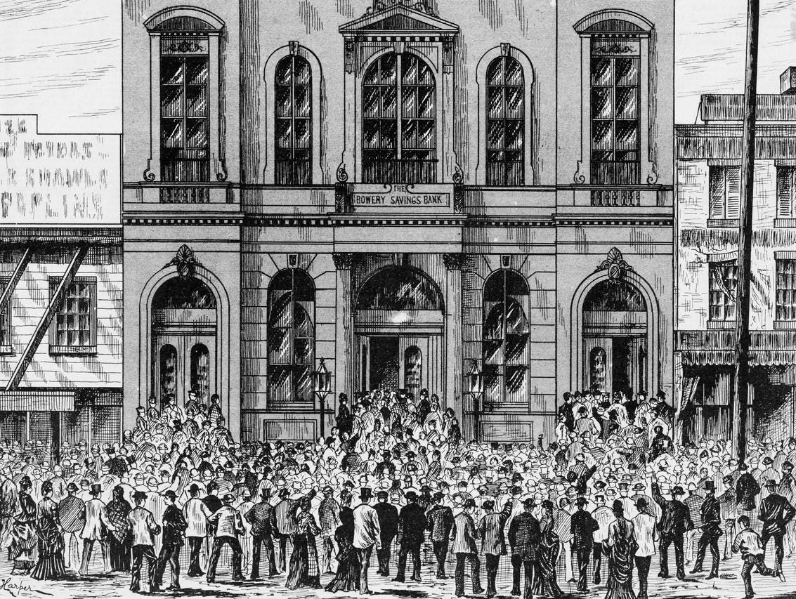 A instabilidade bancária tem sido um fato desagradável da vida há séculos. Somente na América, inúmeras crises financeiras levaram a corridas e falências de bancos. Os bancos faliram em massa durante o Pânico de 1819 e o Pânico de 1837. Oito anos após o fim da Guerra Civil Americana, o colapso da indústria ferroviária levou ao Pânico de 1873, quando pessoas de todo o país correram para sacar seu dinheiro. dos bancos antes que os cofres fossem esvaziados. Pelo menos 100 bancos americanos faliram em 1873, um número enorme dado que o país tinha apenas cerca de um décimo da população que tem hoje. A situação era tão ruim que o Pânico de 1873 ficou conhecido como a “Grande Depressão” na época.