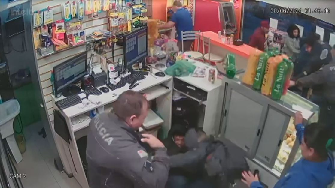 Nesse momento, três policiais militares que faziam ronda no bairro chegaram ao local. Um dos agentes perseguiu um dos assaltantes, que tentaram se refugiar nos fundos da loja. Outro PM se envolveu em luta corporal com um segundo suspeito, enquanto um colega armado com um fuzil também tentaria imobilizá-lo.