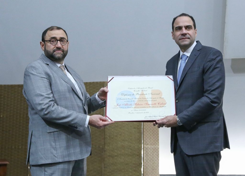 Beto Simonetti recebe o diploma de presidente nacional da OAB das mãos do seu irmão Alberto Simonetti Cabral Neto, conselheiro federal pelo Amazonas.