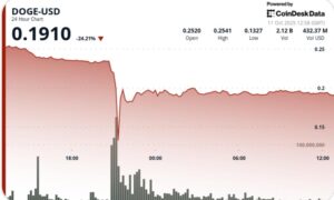 Dogecoin caiu 50% na noite de sexta-feira em um raro flash crash que viu o preço cair de US$ 0,22 para US$ 0,11 em poucos minutos antes de se recuperar para a zona de US$ 0,19 a US$ 0,20.
