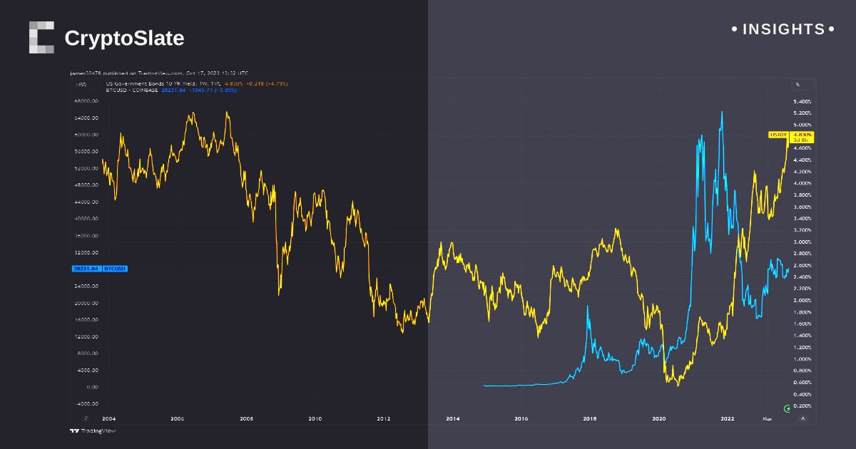 O mercado obrigacionista está a registar uma destruição significativa, como reflectido pelo estado actual da nota de 10 anos dos EUA. Recentemente, o rendimento da nota subiu acima de 4,843%, um máximo nunca visto desde 2007 e apenas 17 pontos base da marca de 5%. Este período de alto rendimento precede a criação do Bitcoin em vários anos, ilustrando há quanto tempo isso aconteceu.