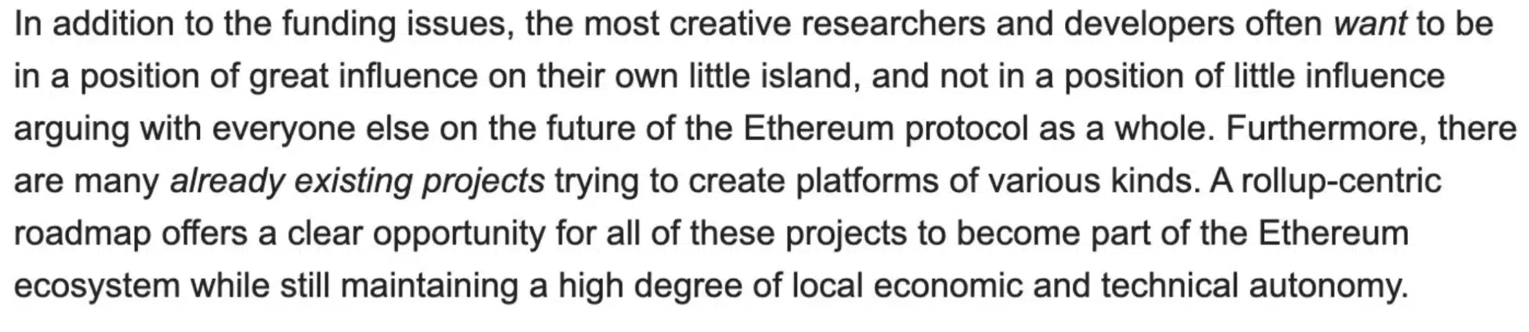 “está tudo bem (na verdade, é bom!) que o Ethereum consista em várias “ilhas” que são únicas, mas ainda assim fazem parte de um Ethereum maior.”