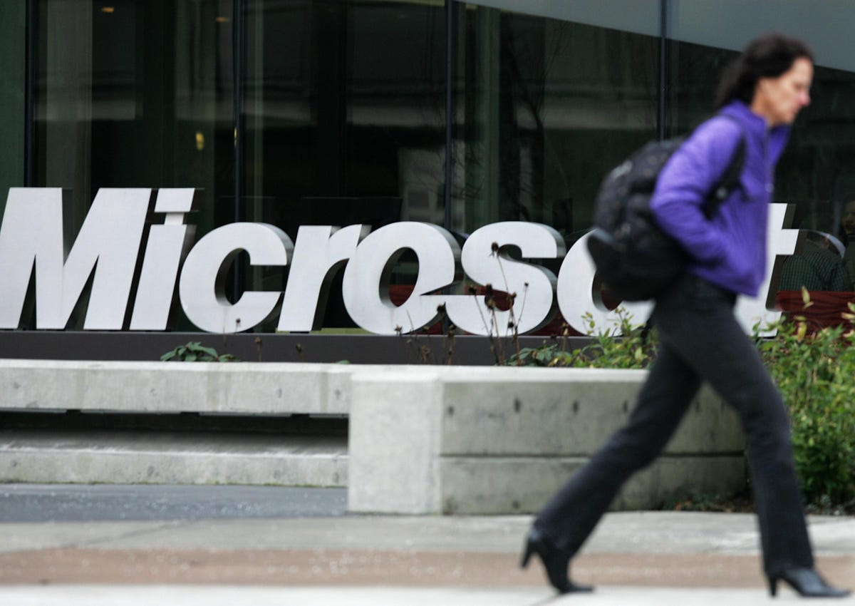 REDMOND, WA – Uma pessoa passa por uma placa da Microsoft (Foto de Robert Giroux/Getty Images)