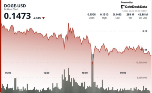 DOGE caiu de US$ 0,1522 para US$ 0,1477 durante a sessão, marcando um declínio de 3% dentro de uma faixa estreita de US$ 0,0070.