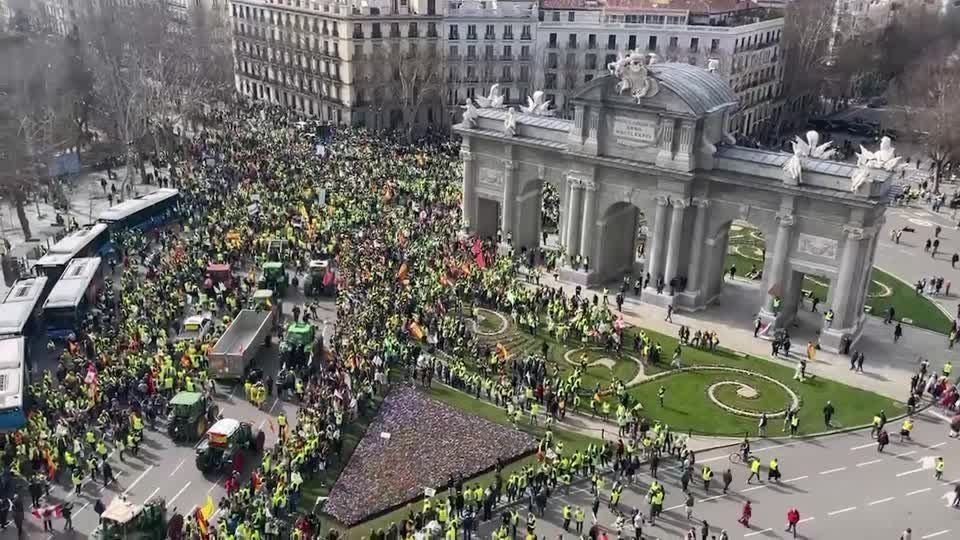 Comboios de tratores interromperam o tráfego em torno da capital da Espanha Nesta quarta-feira (21), em um protesto de agricultores contra o que consideramos como burocracia excessiva e ajudas estatais insuficientes. Eles retornaram no centro de Madri para marchar em direção ao Ministério da Agricultura.