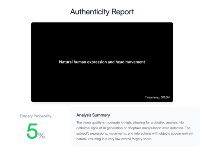 O site deepfakedetector.ai, por exemplo, acessado pelo PC World durante a análise, afirmou que a probabilidade do vídeo ser um deepfake variava entre 5% a 24%. A resposta da ferramenta diz ainda que o material contava com detalhes e expressões faciais nítidas, profundidade de campo, interação natural com objetos e movimentos oculares e frequência de piscadas convincentes.