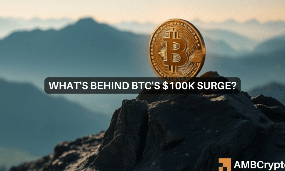 Bitcoin [BTC] ultrapassou a marca de US$ 100.000, alcançando um marco importante para o mercado de criptografia. O aumento dos preços chamou a atenção para factores como o interesse institucional, a evolução regulamentar e o apoio global aos activos digitais.