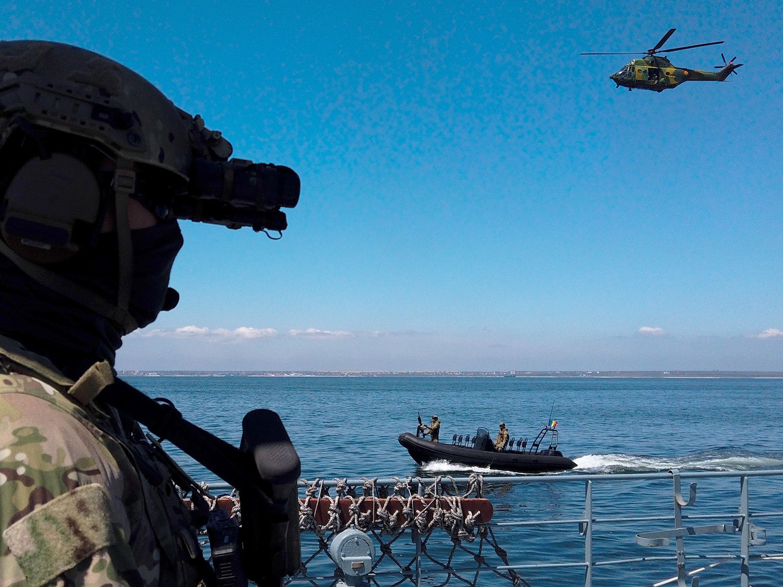 Um soldado da Marinha dos EUA salta de um helicóptero romeno e desliza por uma corda. Ele é uma das várias unidades das forças especiais americanas que participam de um exercício militar no Mar Negro, a apenas 160 milhas da Ucrâniaonde um Rússia continua sua guerra.