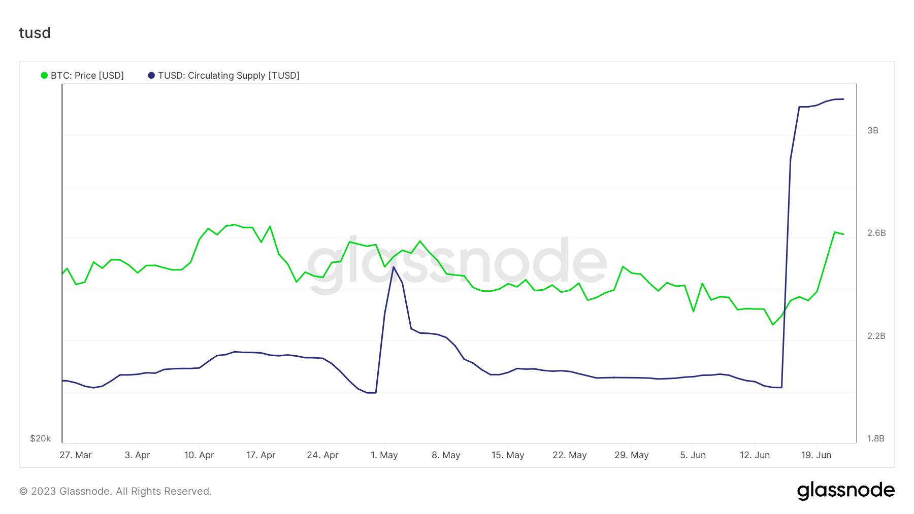 Gráfico mostrando a oferta circulante do preço da TUSD e do BTC entre 26 de março e 23 de junho de 2023 (Fonte: Glassnode)