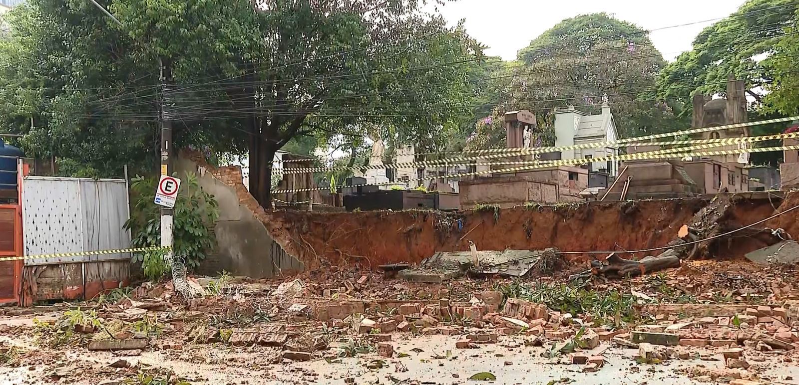 Forte chuva derruba muro de cemitério e obra do metrô em São Paulo