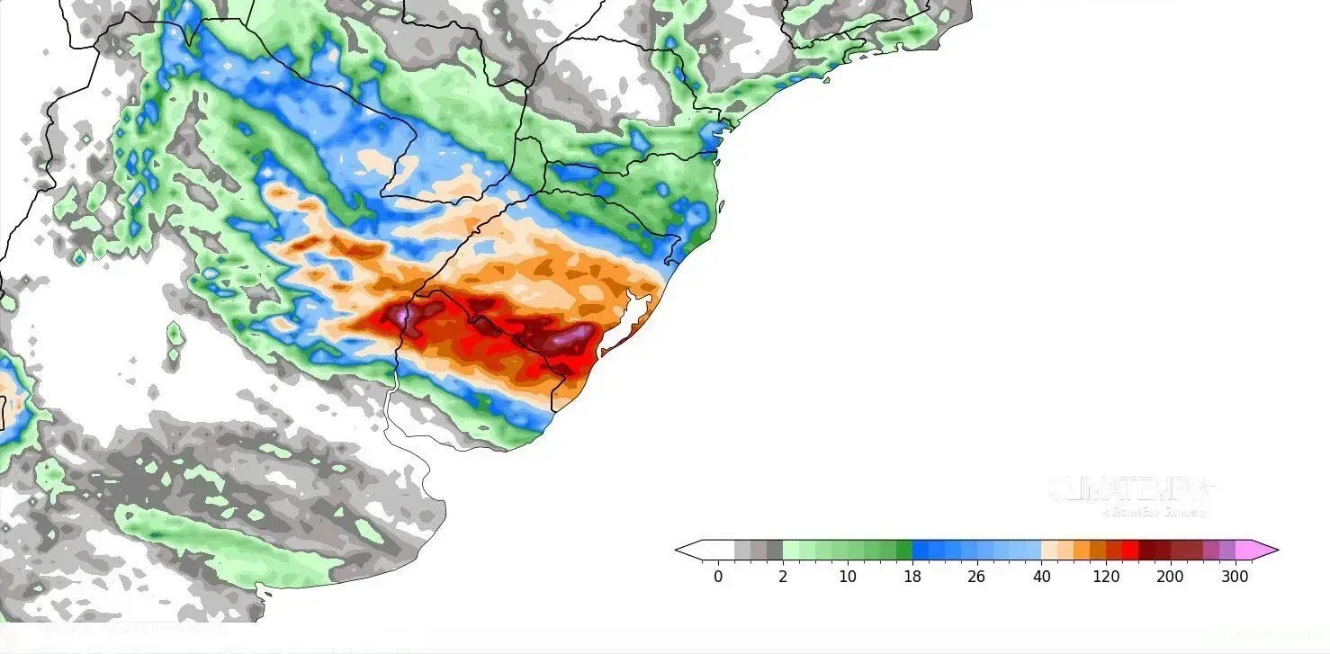 Frente fria estaciona sobre a fronteira do RS e acumulado de chuva pode bater 300 mm