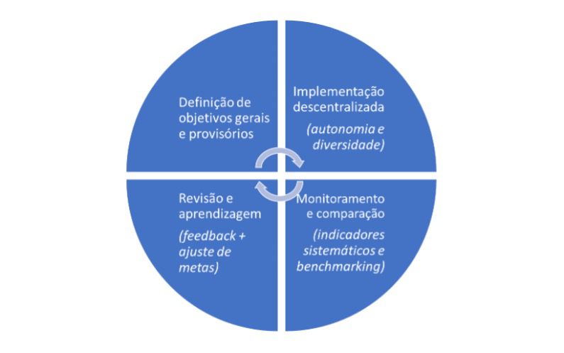 Em termos gerais, esse modelo se estrutura em alguns pilares centrais: definição de objetivos amplos, autonomia local para implementação, monitoramento sistemático de resultados e revisão periódica das estratégias com base em aprendizado coletivo e comparado. Trata-se, portanto, de um arranjo que substitui a lógica de comando e controle por um processo iterativo de tentativa, erro e correção, como ilustrado na figura a seguir.