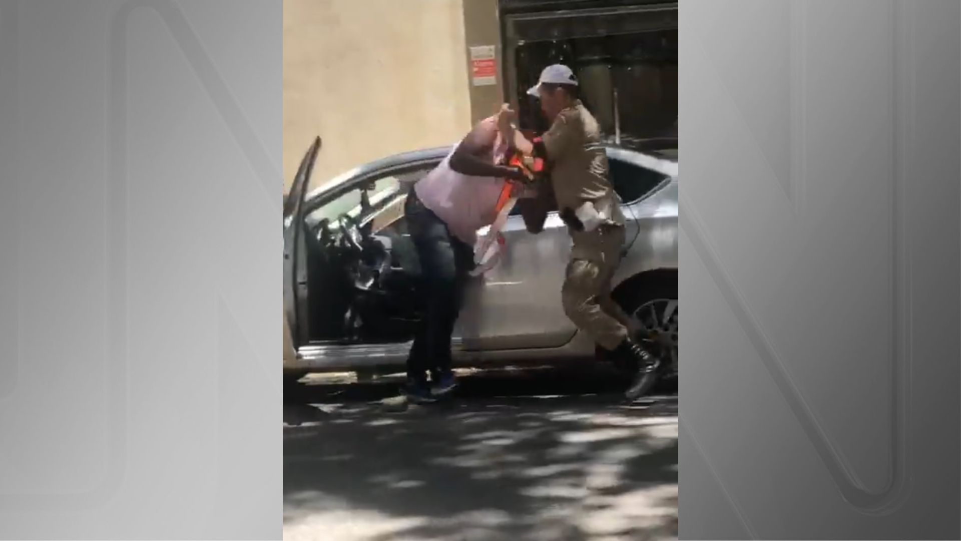 Nas imagens, o homem está sendo agredido enquanto estava dentro do carro. Após alguns instantes, com o motorista já fora do veículo e sob protestos das pessoas ao redor, o guarda se afasta e deixa o local correndo.
