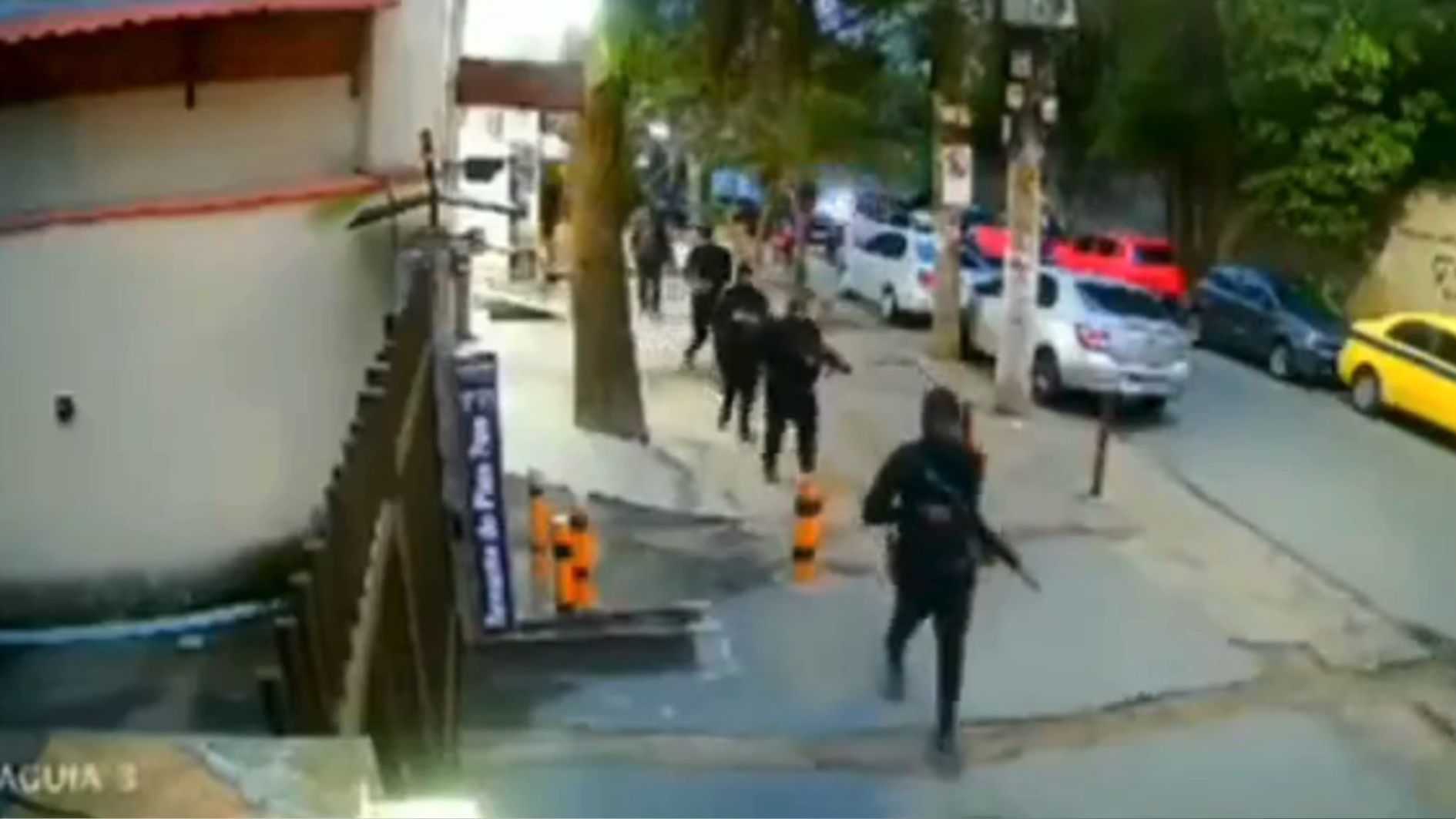 As imagens divulgadas nas redes sociais mostram ao menos 24 homens andando pela calçada com armamento pesado. Algumas infrações tampam os rostos para não serem identificadas.