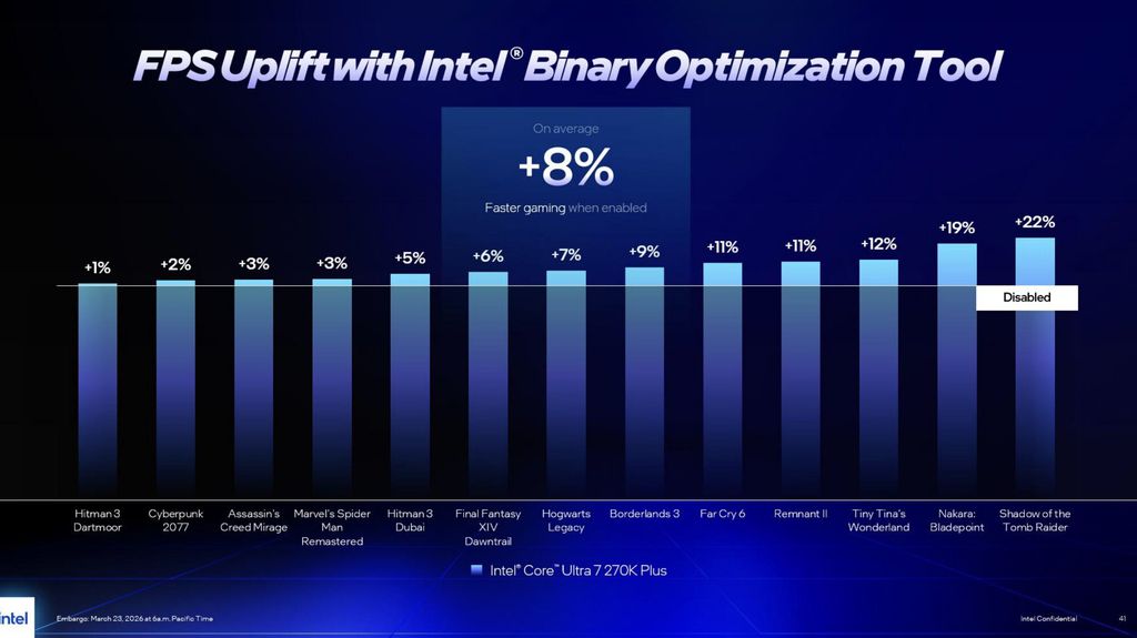 Embora essa tecnologia já fosse usada em ambientes de servidores e data centers, a Intel trouxe resultados interessantes voltados para o PC gamer. O grande destaque foi o teste em Shadow of the Tomb Raider, onde a otimização via Binary Optimization Tool resultou em um salto de 22% na taxa de quadros.