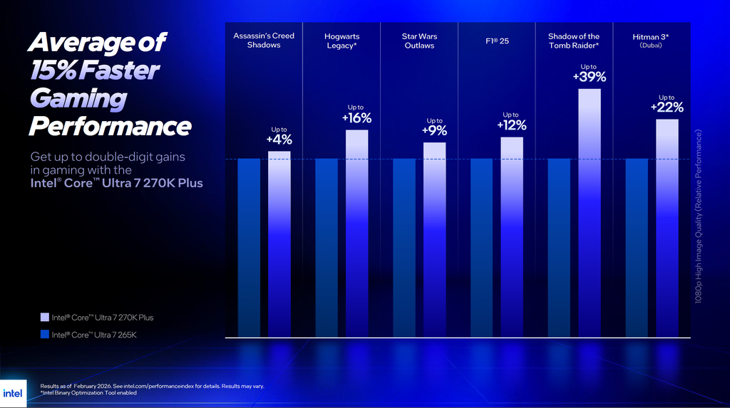 Resultados laboratoriais divulgados pela fabricante mostram que, com o iBOT, o Intel Core Ultra 7 270K Plus entrega até 39% mais desempenho em Shadow of the Tomb Raider e 22% adicionais em Hitman 3. Seu irmão menor, o Core Ultra 5 250K Plus, não ficou para trás e cravou até 24% mais quadros por segundo em Far Cry 6 e até 20% a mais na franquia Borderlands 3.
