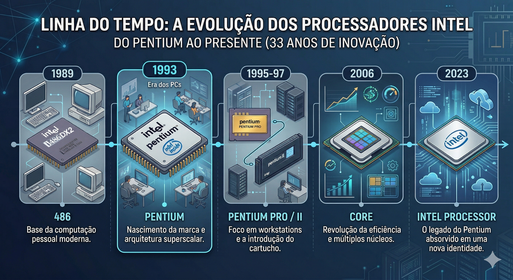 Embora o nome esteja saindo de cena nos portfólios novos, a alma do Pentium permanece em cada chip que prioriza a experiência do usuário final e o reconhecimento de mercado acima de tabelas de especificações.