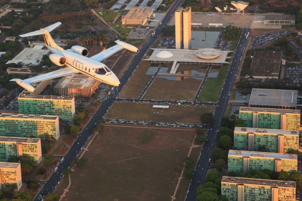 Learjet da FAB sobrevoa a Esplanada dos Ministérios, com o Congresso ao fundo / Crédito: FAB – 7.out.2014